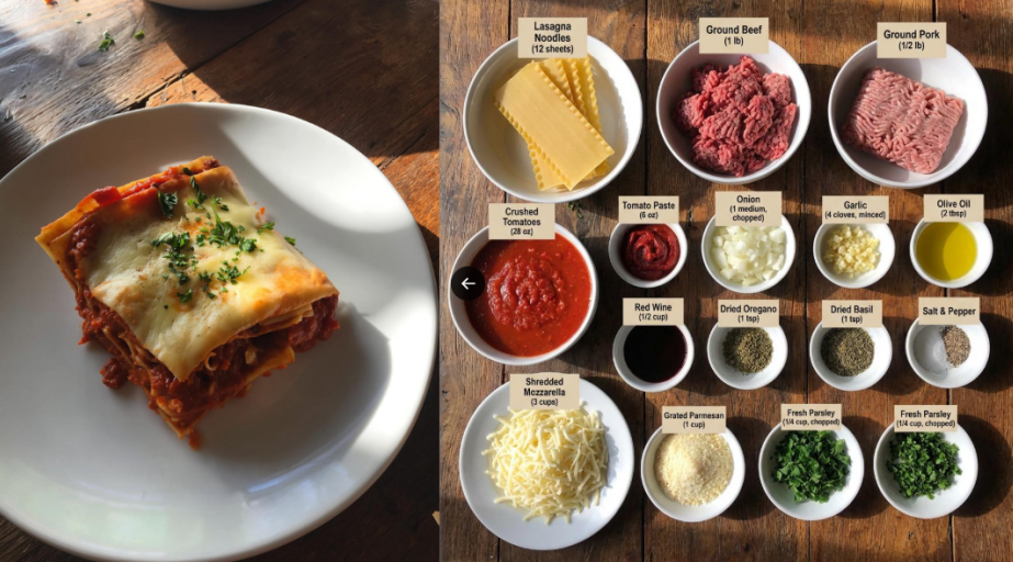 Zeige mir ein Foto aller Zutaten für dieses Gericht. Beschrifte jede Zutat mit Name und Menge.