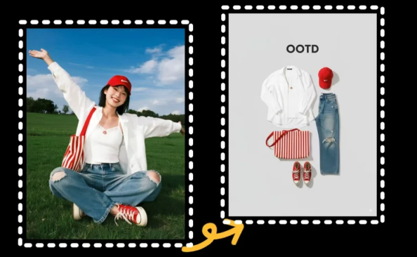 Trenne das Outfit der Figur in einzelne Kleidungsstücke und präsentiere sie auf einem hellen Hintergrund. Verwende ein sauberes, minimalistisches Layout im japanischen Posterstil und füge den Titel „OOTD“ hinzu.