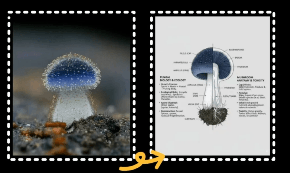 Erstelle eine frontale, beidseitig symmetrische anatomische Illustration eines Pilzes im Infografik-Stil. Die Darstellung soll sowohl äußere Merkmale auf beiden Seiten als auch teilweise geöffnete innere Strukturen zeigen. Ergänze ausführliche erklärende Texte zu biologischen Eigenschaften, Wachstumsprozess, ökologischen Funktionen, Toxizitätsmerkmalen und den Aufgaben der anatomischen Teile. Das Design soll klar, wissenschaftlich und informativ wirken.
