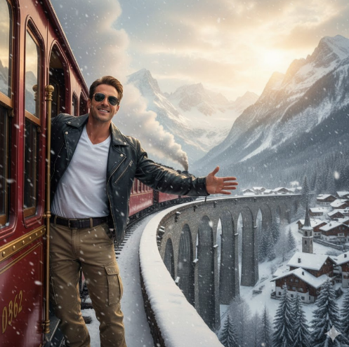 Cinematisches Foto mit der Person aus dem hochgeladenen Referenzbild. Das Gesicht muss zu hundert Prozent korrekt übernommen werden. Die Person trägt Sonnenbrille, schwarze Jacke, weißes T-Shirt und beige Cargohose und lehnt sich lächelnd mit ausgebreiteten Armen aus der Tür eines rot-goldenen Vintage-Zuges. Der Zug fährt über ein verschneites Viadukt, dichter Schneefall, Wintergebirge, europäisches Dorf. Dramatisches Licht und magische Winterstimmung. Sehr hohe Details, 8K.