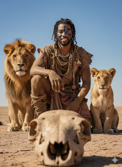 Licht ist hell und natürlich aus der Mittagssonne. Warme, erdige Farbtöne. Kamerawinkel niedrig, Fokus auf Person und Löwen, Vordergrund bleibt weichgezeichnet. Klarer Himmel ohne Wolken.