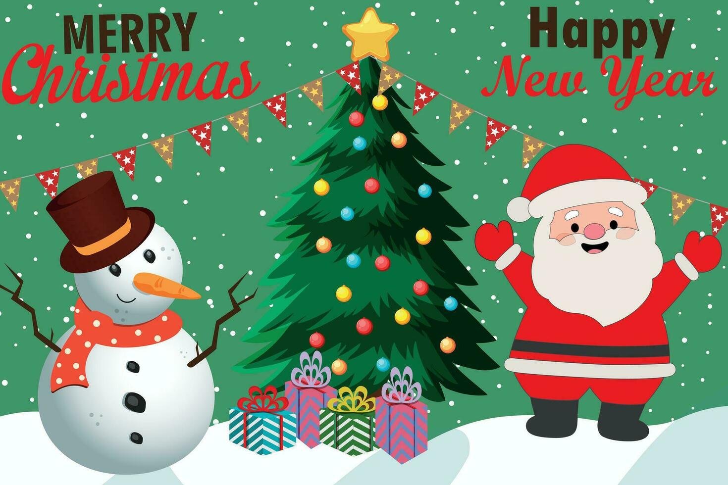 Green Merry Christmas and happy new year card featuring snowmen, Christmas trees, and Santa Claus