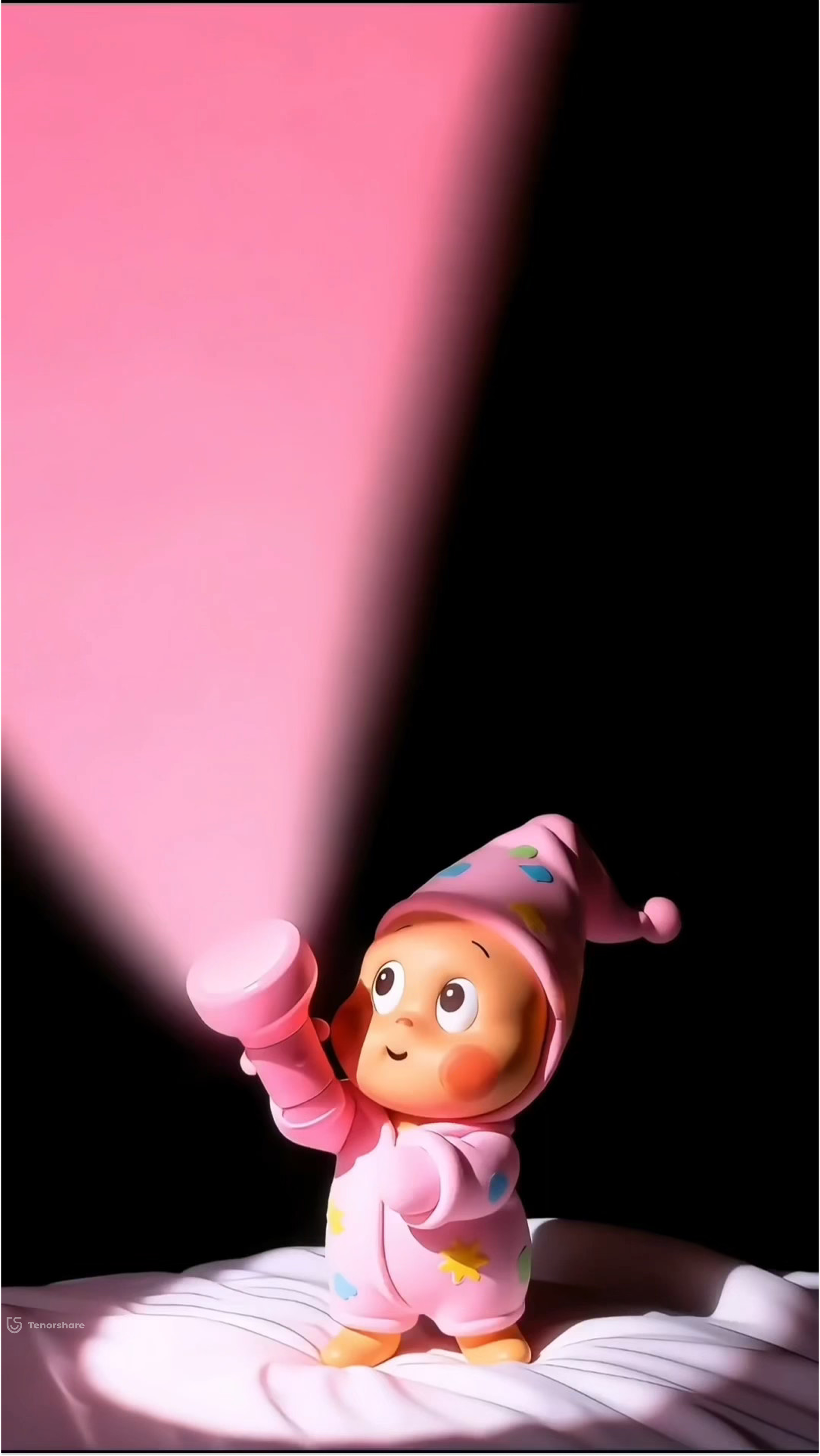 · A cute character dressed in pink pajamas and a matching pointy hat decorated with stars. It stands in a dark room, holding a large pink flashlight that shines a wide beam of bright pink light upwards.